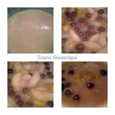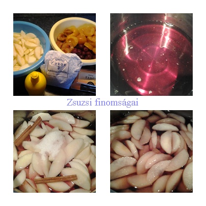 Az almákat meghámozom és felszeletelem. Citromos vízbe teszem, hogy ne barnuljon meg. A befőttek levét a fazékba szűröm, a gyümölcsöket félreteszem. A gyümölcsléhez hozzáadom az almát, a fahéjat, a cukrot és a citromlevet, majd egy kevés vizet adok hozzá. Felteszem főni. Mikor felforrt, beleteszem a többi gyümölcsöt is, és újra felforralom.