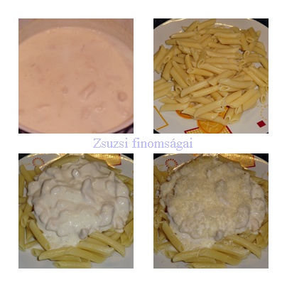 Egy adag tésztát tányérra halmozok, majd két-három szedőkanálnyi tejszínes csirkemellet szedek a tetejére, megszórom reszelt sajttal és tálalom.